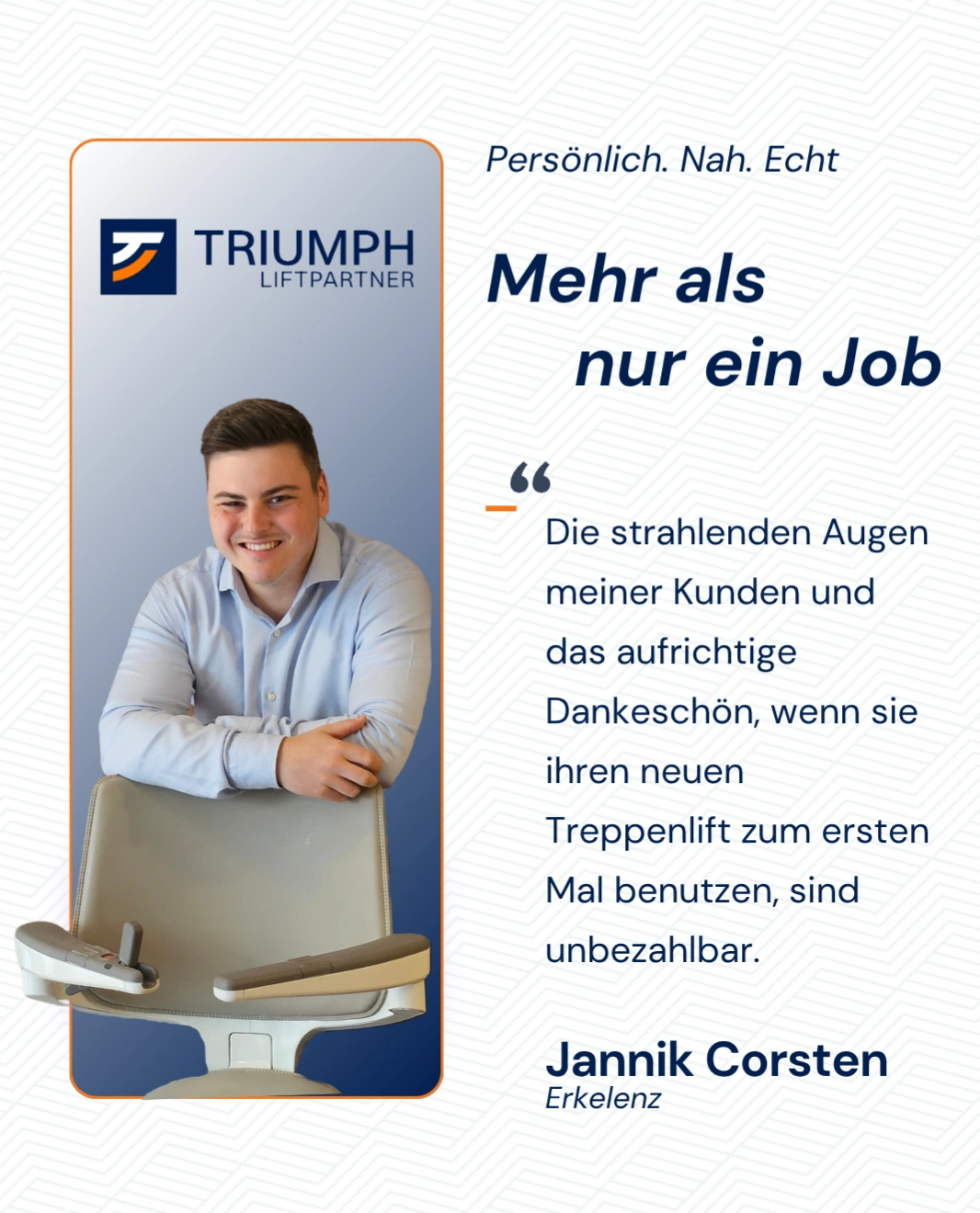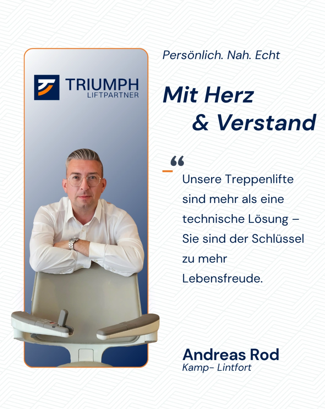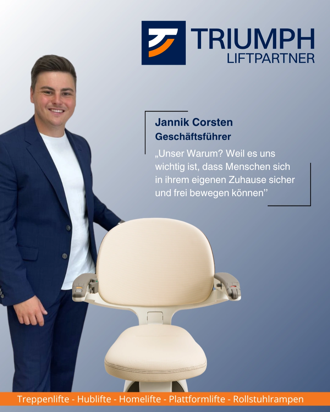 TRIUMPH LIFTPARTNER ist nicht nur ein Name, sondern steht für erstklassiges Know-how und hochwertigen Service. Das Franchiseunternehmen setzt sich dafür ein, Menschen mehr Unabhängigkeit und Lebensqualität zu schenken – eine Mission, die in unserer Gesellschaft zunehmend an Bedeutung gewinnt.
